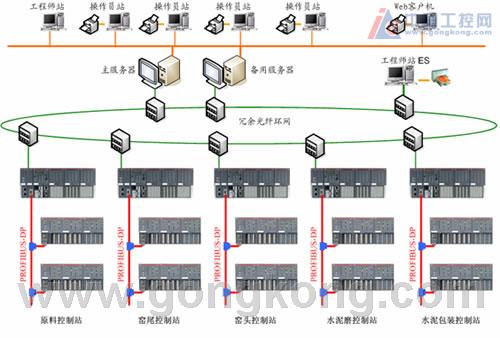 水泥生產(chǎn)的各個(gè)控制站極為分散,此時(shí)系統(tǒng)的安全很大程度上取決于控制網(wǎng)絡(luò)的穩(wěn)定性。冗余光纖環(huán)網(wǎng)技術(shù)的設(shè)計(jì)與采用使得過(guò)程控制網(wǎng)絡(luò)極為可靠,大大提高了整個(gè)系統(tǒng)的安全系數(shù)。