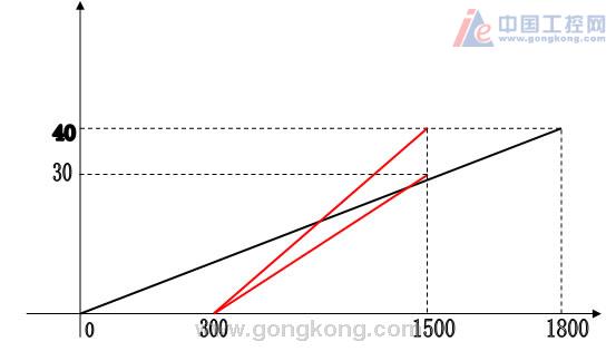 本系統(tǒng)的一個(gè)技術(shù)難點(diǎn)就是機(jī)器在印刷不同規(guī)格的玻璃時(shí),印數(shù)軸的工作行程要求可以是隨意調(diào)整的,例如:印刷軸的最大工作行程時(shí)0~1800mm,離網(wǎng)的最大工作行程是0~40mm,他的同步關(guān)系如下圖黑色線所示,但在印刷小玻璃時(shí),為了提高效率,可能需要將印刷工作行程改為300~1500mm,離網(wǎng)同步的關(guān)系改成下圖紅色線所示,